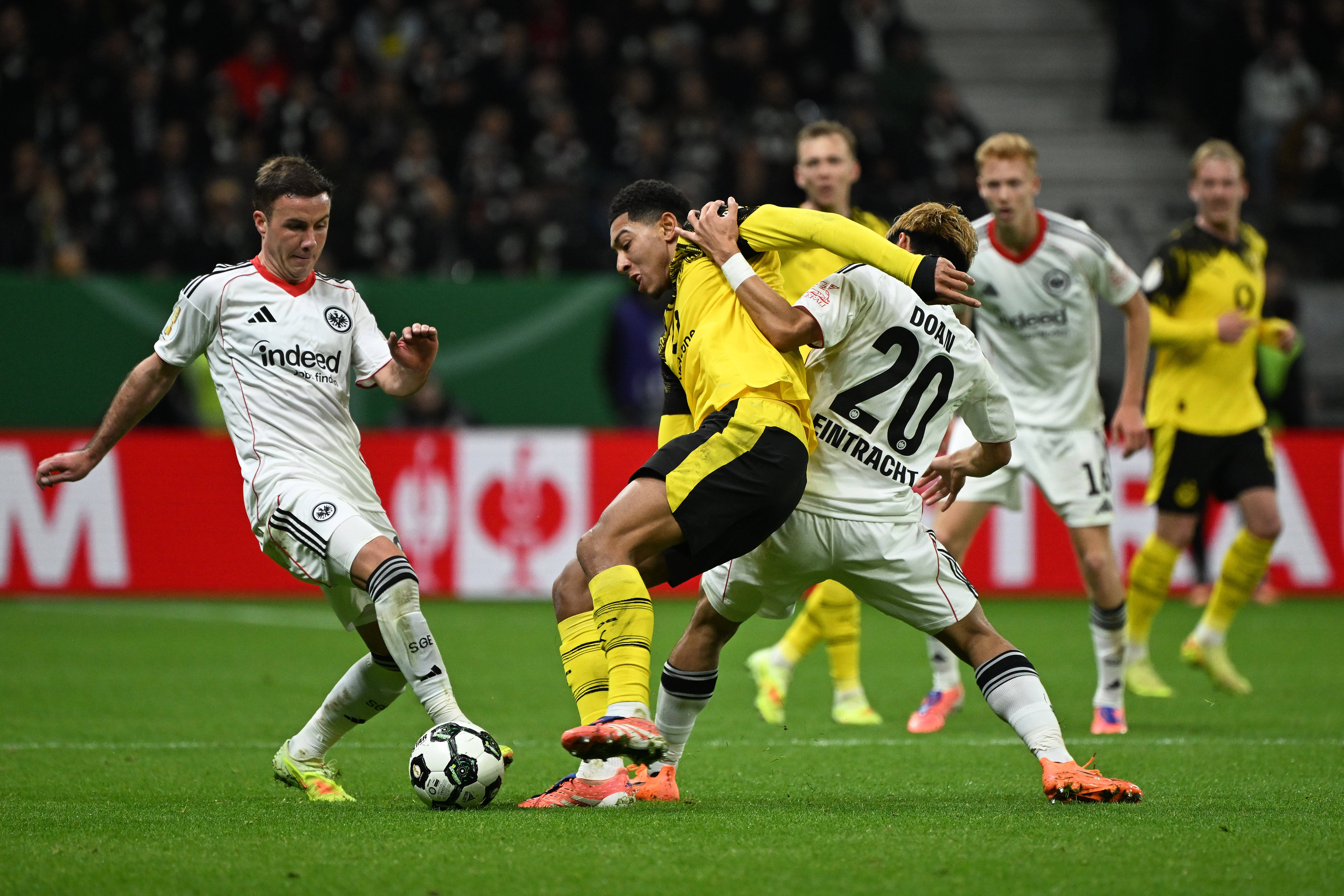 10月28日,法兰克福队球员堂安律(前右)、格策(前左)与多特蒙德队球员贝林厄姆(前中)在比赛中拼抢。 新华社发(乌尔里希·胡夫纳格尔 摄)