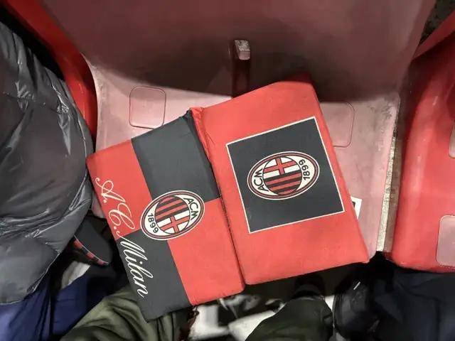 我左右两边的球迷体型都偏大,我被夹在中间,与他们一起组成了一个“三明治”。这导致我拍摄照片和视频都变得十足费劲,但也很温暖。被两个壮汉固定在塑料座椅上,需要经受比较大的考验。我旁边的那位球迷就比较有经验了,专门带了一个带有AC米兰队徽的座垫。