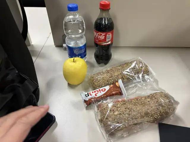 媒体工作餐算得上丰盛了:两个三明治——一个三文鱼三明治,一个是金枪鱼三明治;两瓶饮料——一瓶矿泉水,一瓶可口可乐;另外还有一个水果、一块巧克力和一张纸巾。三明治的个头非常大,一个就足以吃饱。我就着那瓶矿泉水,吃了那个三文鱼三明治,口感还不错,吹毛求疵的话就是略微有点咸。